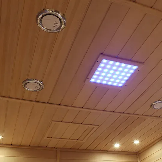 3. Pengalaman Pemanasan & Pencahayaan: Panel pemanasan infra merah sing disebarake merata ngirimake panas sing lembut lan nembus; ndhuwur + lampu sekitar sisih (ing nada anget) ngedongkrak istirahat lan supaya stuffiness utawa oppression
