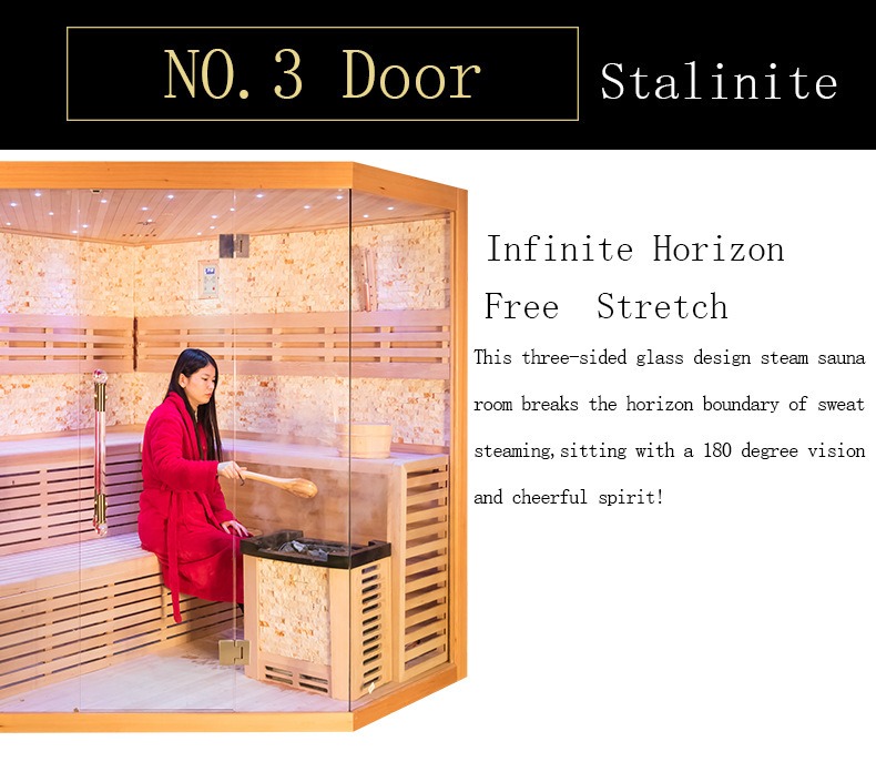 Inovatif nampilake struktur lawang kaca khusus Stalinite telung sisi, kaca iki ngalami perawatan temper suhu dhuwur khusus, menehi tahan panas lan resistensi dampak sing luar biasa. Iki njaga stabilitas sanajan ing suhu ngluwihi 70 ℃ ing sauna, kanthi transparansi sing dhuwur banget lan ora ana distorsi optik. Desain kaca telu-sisi entuk tampilan sudhut 180-derajat sing ora dihalang-halangi, ngilangi rasa sauna tradisional sing sempit lan tertutup. Pangguna bisa njaga kontak visual karo lingkungan njaba nalika nglangen sauna, dadi becik kanggo balconies ngarep, plataran, lan skenario liyane-ngidini sampeyan kanggo appreciate sesawangan njaba nalika ngalami therapy panas kanggo pikiran lan awak luwih anteng lan nyaman. Kajaba iku, sistem ambiance cahya lintang sing terintegrasi kanthi internal nggawe efek lintang sing kelip-kelip liwat jalur lampu LED sing didhelikake ing tembok sisih ndhuwur lan sisih. Cahya alus nglengkapi uap anget, kanthi efektif ngilangake kesel mripat lan ningkatake swasana sauna sing immersive lan nyenengake.