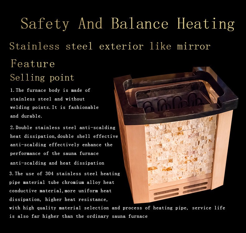 Komponen pemanasan inti nganggo pemanas sauna sing aman lan tahan lama, kanthi pertimbangan sing ketat saka bahan nganti struktur: