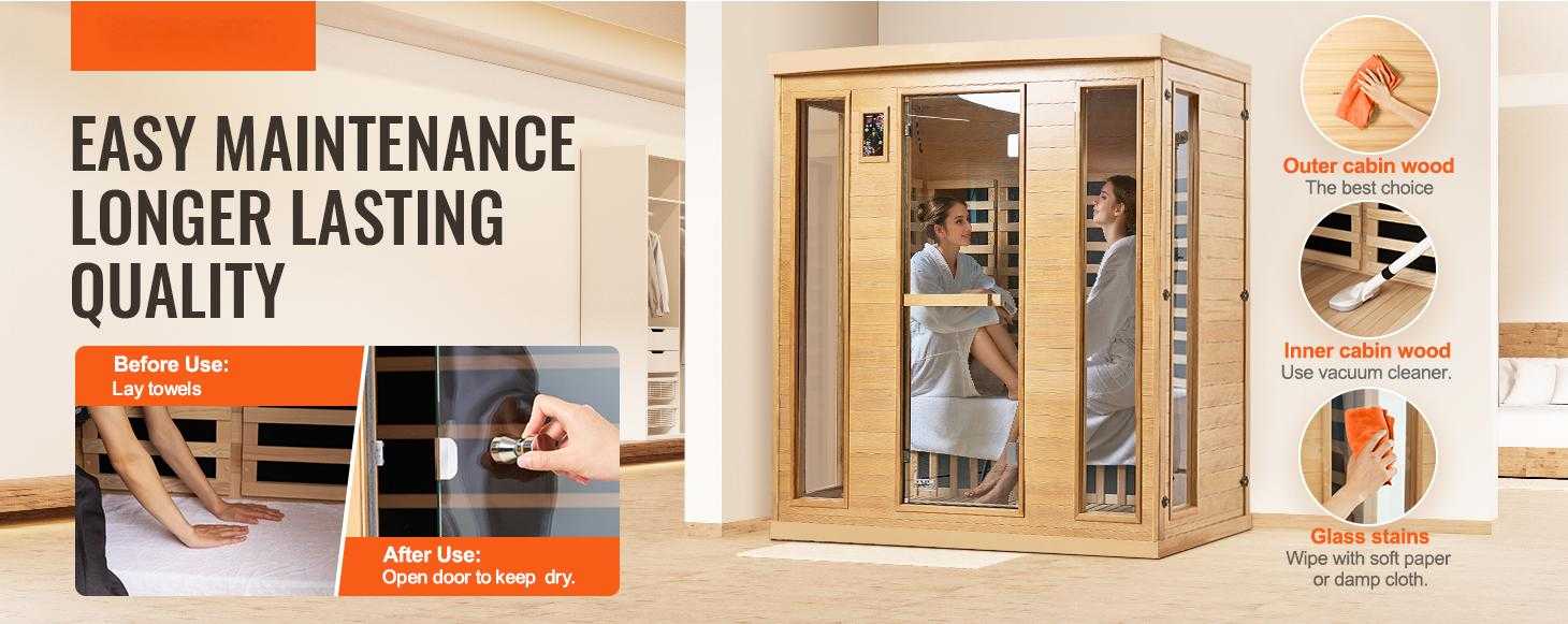 Gunakake andhuk lembab sing resik kanggo ngilangi bangku, lantai lan ing panel mburi. Aja nggunakake andhuk sing udan banget udan lan bisa netes banyu ing sauna lan ora nggunakake agen sing diisi ing sauna. Priksa manawa supaya sauna garing lan resik. Aja ninggalake andhuk utawa waterglasses utawa botol ing njero sauna sawise nggunakake. Ngilangke permukaan sauna eksternal karo andhuk lan ngresiki gelas ing kecepatan saben wulan.
