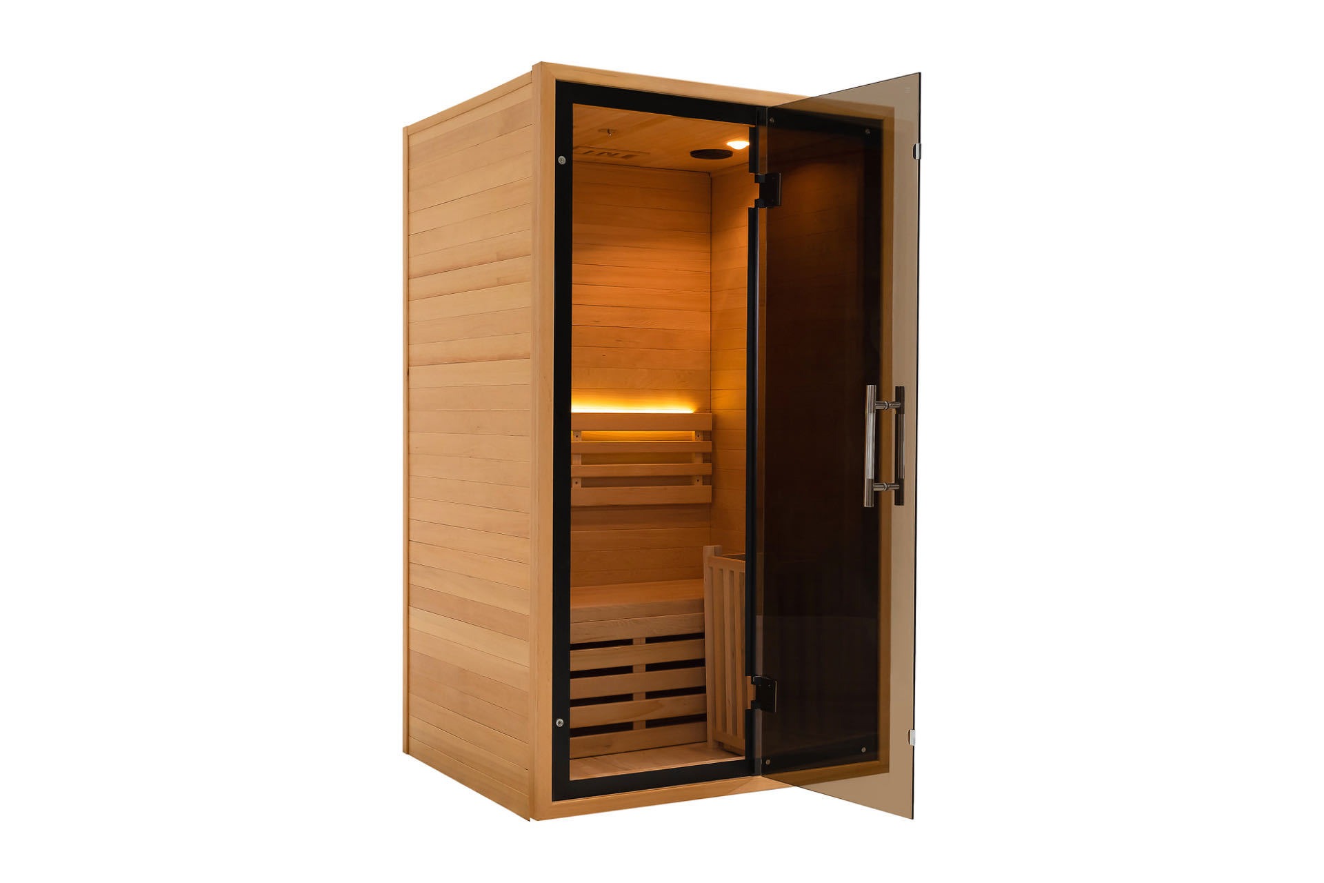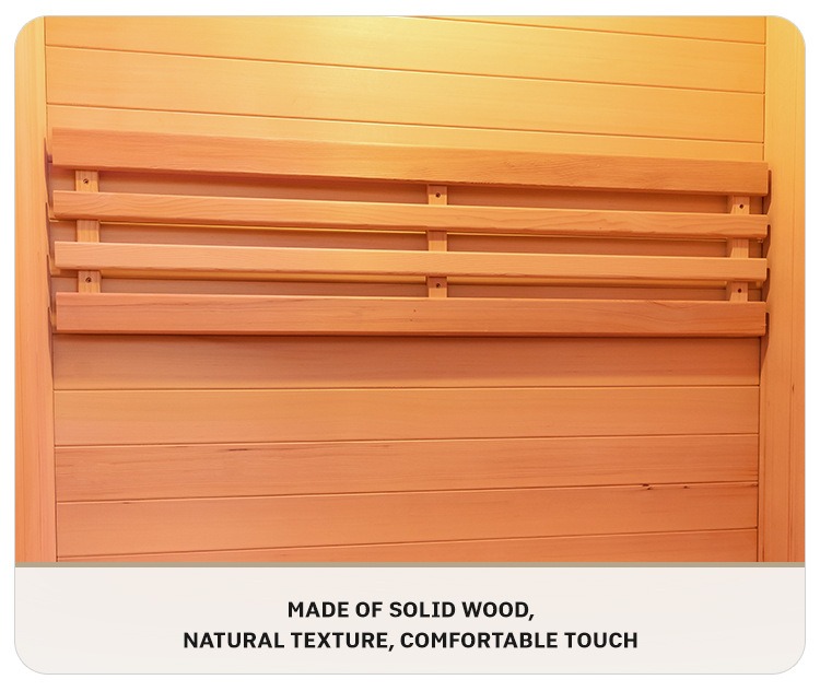 Loro kayu premium Kanada, Hemlock lan Red Cedar, dipilih. Kayu kasebut atos lan awet, kanthi tekstur alami sing cetha lan warna sing seragam. Sifat alami saben potongan kayu menehi sauna kanthi tekstur sing unik, nyuntikake gen estetika alami lan dhuwur menyang ruang kesehatan omah. Sauna inframerah njero ruangan kanggo omah.