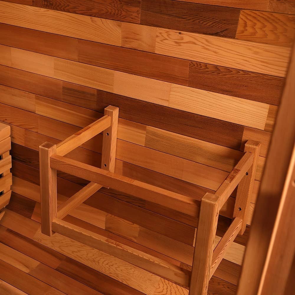 - Bahan Utama: Kayu padhet tahan panas sing berkualitas tinggi digunakake ing saindhenging (tembok, bangku, lan pigura kabeh kayu padhet), diolah kanthi profesional kanggo kelembapan lan tahan panas kanggo adaptasi karo lingkungan sauna kanthi suhu dhuwur lan asor.