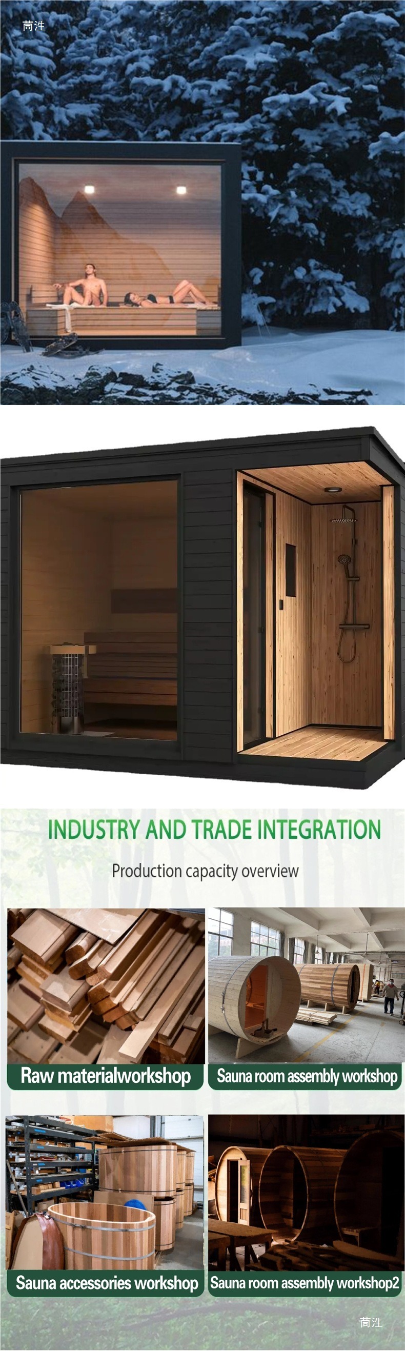 - Area padhang mandiri: mbilas langsung, ora perlu ngasilake ing njero ruangan: sistem pancuran mandiri sing dibangun kanthi banyu panas lan adhem sing luwes. Sawise kringet ing sauna, sampeyan bisa langsung mbuwang tanpa lelungan ing njero ruangan, njamin pengalaman istirahat lan trep.